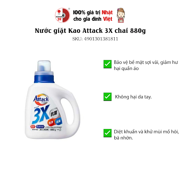 Nước giặt Kao Attack 3X chai 880g