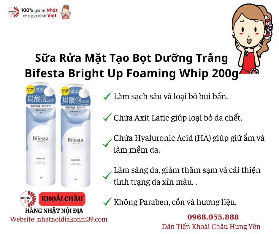𝐒𝐮̛̃𝐚 𝐫𝐮̛̉𝐚 𝐦𝐚̣̆𝐭 𝐁𝐢𝐟𝐞𝐬𝐭𝐚 𝐃𝐚̣𝐧𝐠 𝐁𝐨̣𝐭 𝐁𝐫𝐢𝐠𝐡𝐭𝐮𝐩 𝟏𝟖𝟎𝐠 là sản phẩm dạng bọt tạo sẵn giúp làm sạch sâu, làm sáng và đều màu da. Với thành phần axit amin và HA, sản phẩm loại bỏ bụi bẩn, tế bào chết và cung cấp độ ẩm cho da, mang lại làn da sáng mịn.